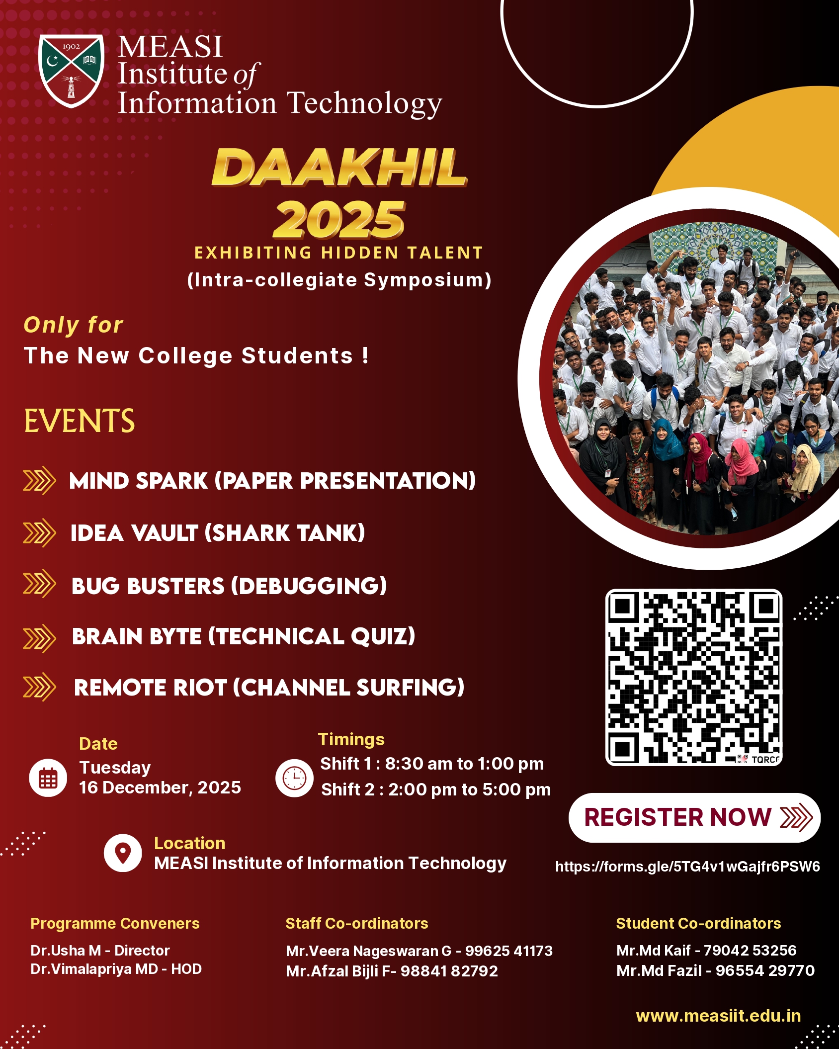 🎉 MEASI Institute of Information Technology is organizing DAAKHIL 2025 — an Intra-Collegiate Symposium exclusively for The New College students! 🚀