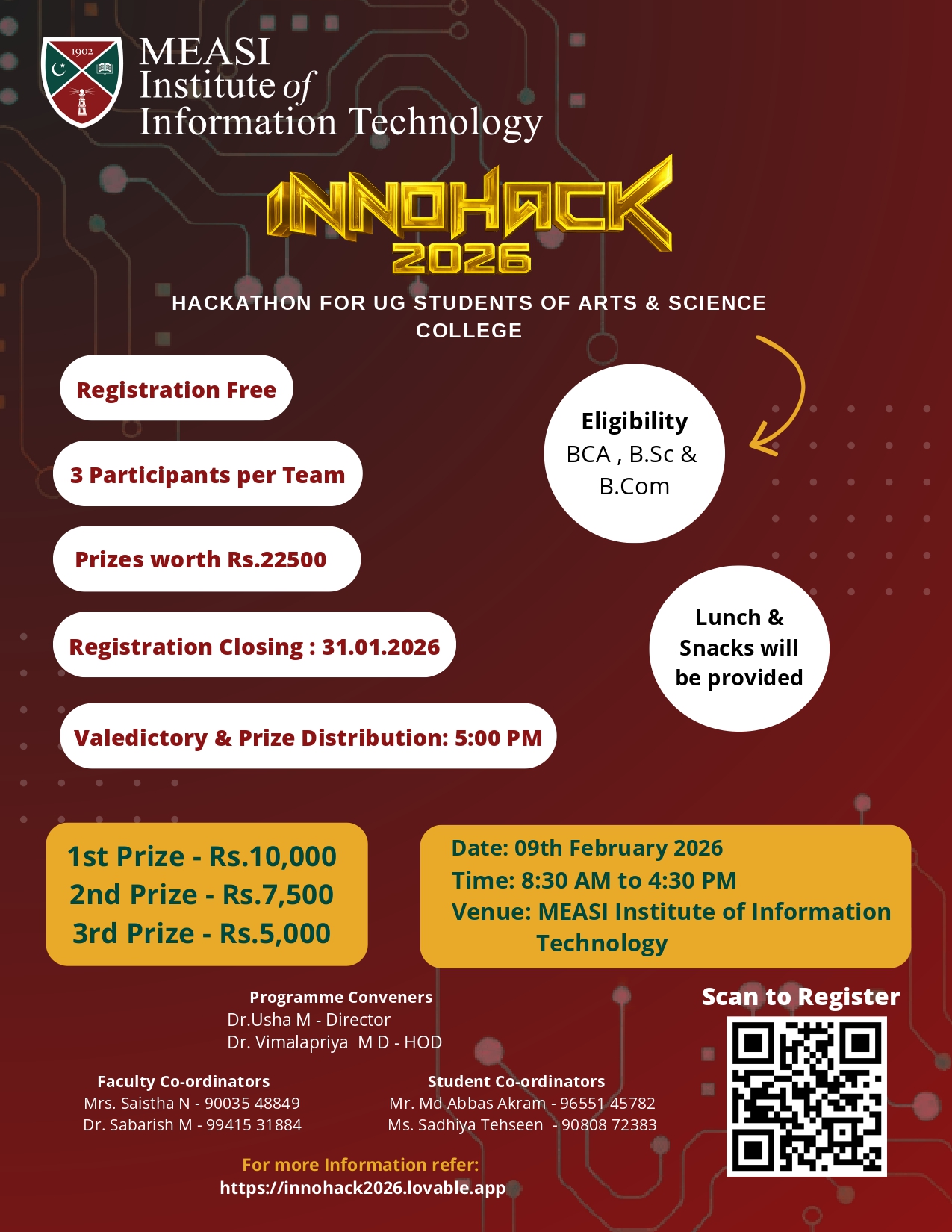 The Department of MCA, MEASI Institute of Information Technology proudly presents INNOHACK 2K26, an exciting Hackathon for UG students of Arts & Science Colleges.